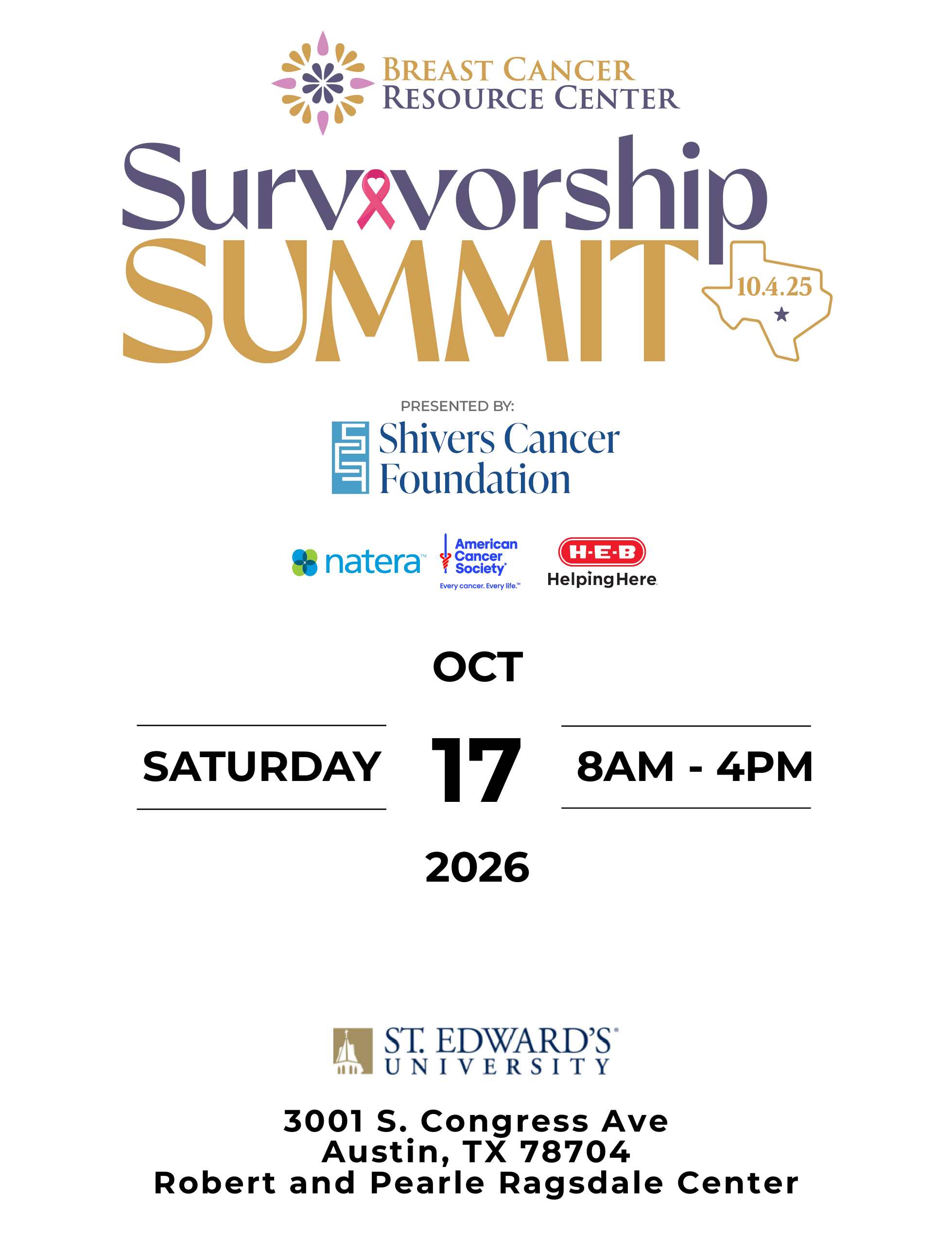 The Survivorship Summit is a one-day educational event designed specifically for those newly diagnosed, in or out of treatment and those living with metastatic breast cancer. Hosted by Breast Cancer Resource Center, this summit addresses the often-overlooked challenges of life after diagnosis, providing trusted guidance, expert-led sessions, and a supportive space for healing.